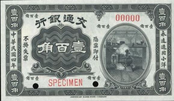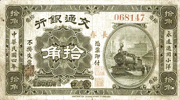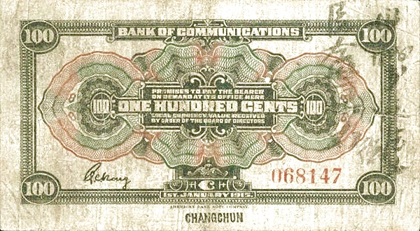 100 / 100 / BANK OF COMMUNICATIONS / PROMISES TO PAY THE BEARER ON DEMAND AT ITS OFFICE HERE LOCAL ONE HUNDRED CENTS CURRENCY VALUE RECIEVED BY ORDER OF THE BOARD OF DIRECTORS / 1st JANUARY 1915 / 100 / 100 / CHANGCHUN