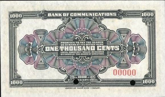 1000 / 1000 / BANK OF COMMUNICATIONS / PROMISES TO PAY THE BEARER ON DEMAND AT ITS OFFICE HERE LOCAL ONE THOUSAND CENTS CURRENCY VALUE RECIEVED BY ORDER OF THE BOARD OF DIRECTORS / 1000 / 1st JANUARY 1915 / 1000 / 1000