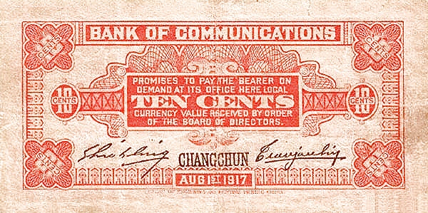 10 CENTS / 10 CENTS / BANK OF COMMUNICATIONS / 10 CENTS / PROMISES TO PAY THE BEARER ON DEMAND AT ITS OFFICE HERE LOCAL TEN CENTS CURRENCY VALUE RECIEVED BY ORDER OF THE BOARD OF DIRECTORS / 10 CENTS / CHANGCHUN AUG 1st 1917 / 10 CENTS / 10 CENTS
