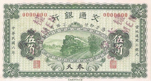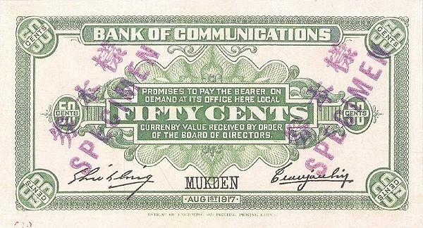 50 CENTS / 50 CENTS / BANK OF COMMUNICATIONS / 50 CENTS / PROMISES TO PAY THE BEARER ON DEMAND AT ITS OFFICE HERE LOCAL FIFTY CENTS CURRENCY VALUE RECIEVED BY ORDER OF THE BOARD OF DIRECTORS / 50 CENTS / MUKDEN AUG 1st 1917 / 50 CENTS / 50 CENTS