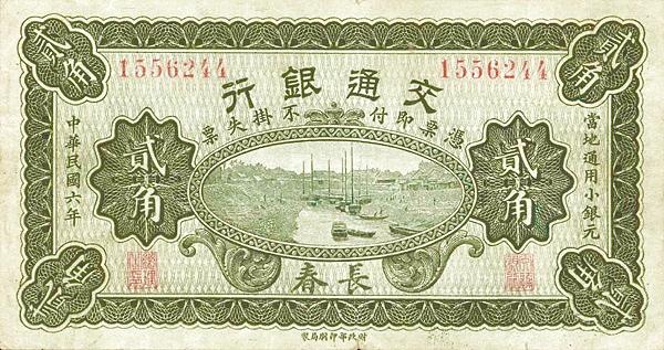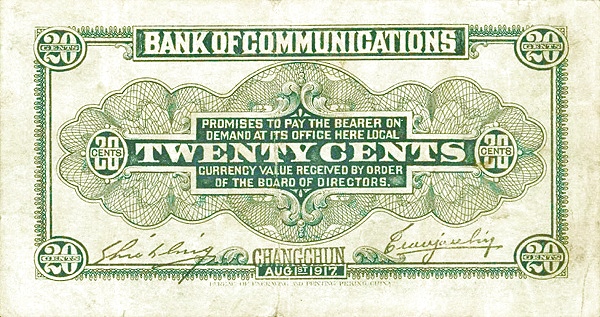 20 CENTS / 20 CENTS / BANK OF COMMUNICATIONS / 20 CENTS / PROMISES TO PAY THE BEARER ON DEMAND AT ITS OFFICE HERE LOCAL TWENTY CENTS CURRENCY VALUE RECIEVED BY ORDER OF THE BOARD OF DIRECTORS / 20 CENTS / CHANGCHUN AUG 1st 1917 / 20 CENTS / 20 CENTS