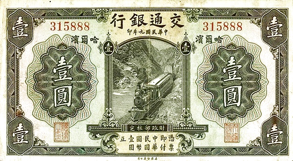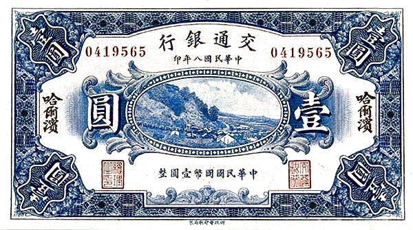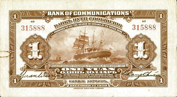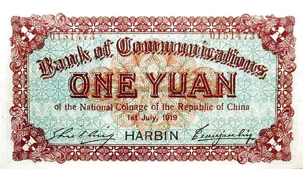 1 / 1 / BANK OF COMMUNICATIONS / ONE YUAN OF NATIONAL COINAGE OF THE REPUBLIC OF CHINA / 1st JULY 1919 / HARBIN / 1 / 1