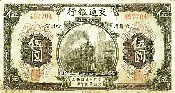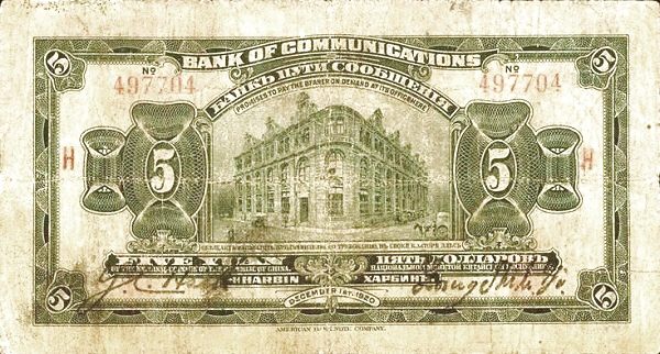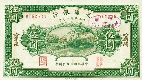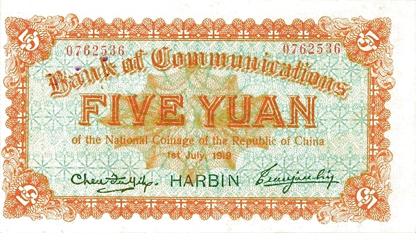 5 / 5 / BANK OF COMMUNICATIONS / FIVE YUAN OF NATIONAL COINAGE OF THE REPUBLIC OF CHINA / 1st JULY 1919 / HARBIN / 5 / 5