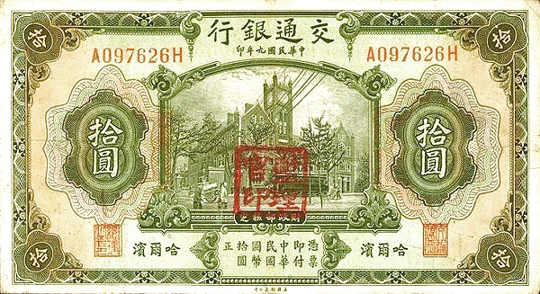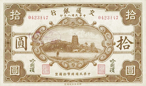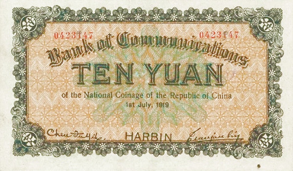 10 / 10 / BANK OF COMMUNICATIONS / TEN YUAN OF NATIONAL COINAGE OF THE REPUBLIC OF CHINA / 1st JULY 1919 / HARBIN / 10 / 10