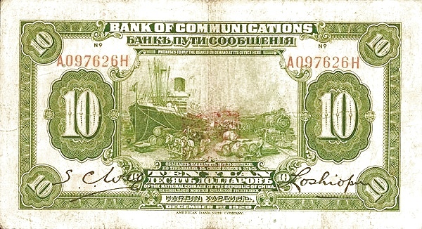 10 / 10 / BANK OF COMMUNICATIONS / БАНКЪ ПУТИ СООБЩЕНИЯ / 10 / PROMISES TO PAY THE BEARER ON DEMAND AT ITS OFFICE HERE / ОБЕЩАЕТЪ ВЫПЛАТИТЬ ПРЕДЪЯВИТЕЛЮ, ПО ТРЕБОВАНИЮ, ВЪ СВОЕЙ КОНТОРЕ ЗДЕСЬ / TEN YUAN / ДЕСЯТЬ ДОЛЛАРОВЪ / OF NATIONAL COINAGE OF THE REPUBLIC OF CHINA / НАЦИОНАЛЬНОЙ МОНЕТОЙ КИТАЙСКОЙ РЕСПУБЛИКИ / 10 / HARBIN ХАРБИН / DECEMBER 1st 1920 / 10 / 10