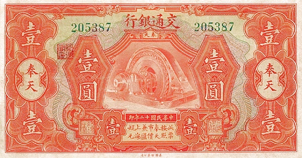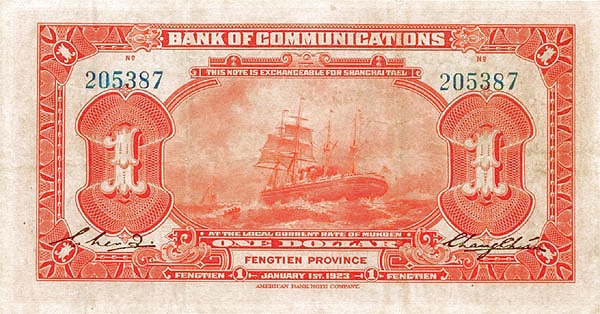 1 / 1 / BANK OF COMMUNICATIONS / 1 / THIS NOTE IS EXCHANGABLE FOR SHANGHAI TAEL / AT THE LOCAL CURRENT RATE IN MUKDEN / ONE DOLLAR / FENGTIEN PROVINCE / 1 / JANUARY 1st 1923 / 1 / 1