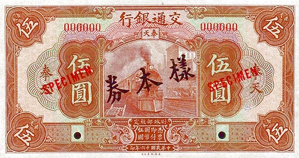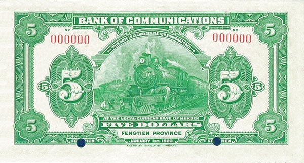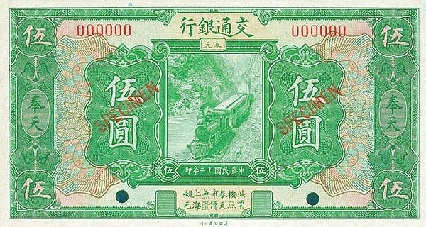 5 / 5 / BANK OF COMMUNICATIONS / 5 / THIS NOTE IS EXCHANGABLE FOR SHANGHAI TAEL / AT THE LOCAL CURRENT RATE IN MUKDEN / FIVE DOLLARS / FENGTIEN PROVINCE / 5 / JANUARY 1st 1923 / 5 / 5