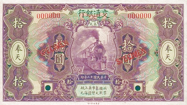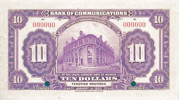 10 / 10 / BANK OF COMMUNICATIONS / 10 / THIS NOTE IS EXCHANGABLE FOR SHANGHAI TAEL / AT THE LOCAL CURRENT RATE IN MUKDEN / TEN DOLLARS / FENGTIEN PROVINCE / 10 / JANUARY 1st 1923 / 10 / 10