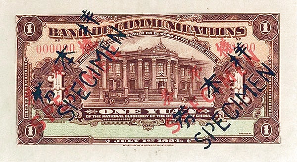 1 / 1 / BANK OF COMMUNICATIONS / 1 / PROMISES TO PAY THE BEARER ON DEMAND IN ITS OFFICE HERE / ONE YUAN OF THE NATIONAL CURRENCY OF THE REPUBLIC OF CHINA / 1 / SHANGHAI JULY 1st 1924 / 1 / 1