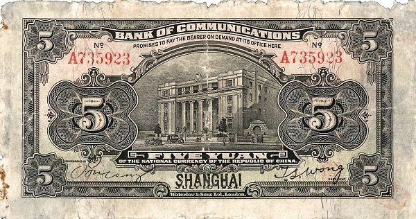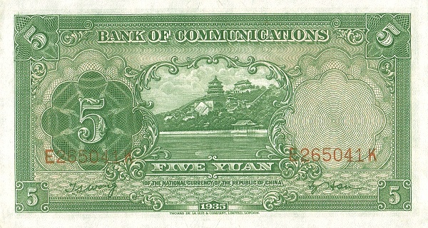 5 / 5 / BANK OF COMMUNICATIONS / 5 / FIVE YUAN OF THE NATIONAL CURRENCY OF THE REPUBLIC OF CHINA / 1935 / 5 / 5