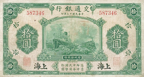 10 / 10 / BANK OF COMMUNICATIONS / 10 / PROMISES TO PAY THE BEARER ON DEMAND IN ITS OFFICE HERE / TEN YUAN OF THE NATIONAL CURRENCY OF THE REPUBLIC OF CHINA / 10 / SHANGHAI JULY 1st 1924 / 10 / 10