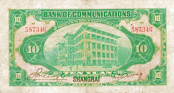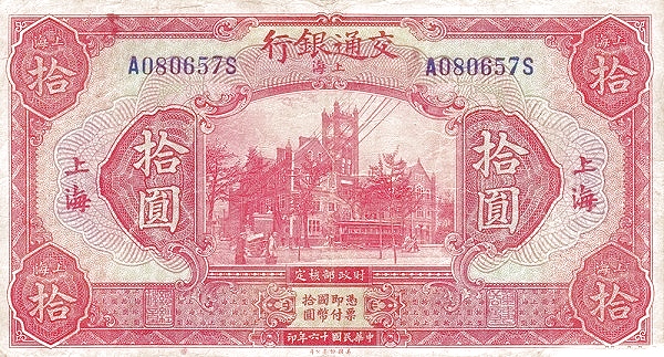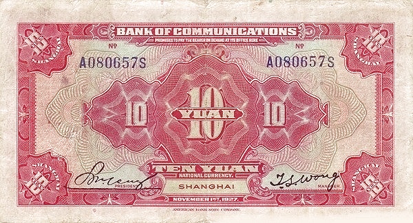 10 YUAN SHANGHAI / 10 YUAN SHANGHAI / BANK OF COMMUNICATIONS / PROMISES TO PAY THE BEARER ON DEMAND IN ITS OFFICE HERE / 10 / 10 YUAN / 10 / TEN YUAN NATIONAL CURRENCY / SHANGHAI NOVEMBER 1st 1927 / 10 YUAN SHANGHAI / 10 YUAN SHANGHAI