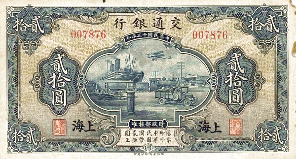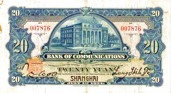 20 / 20 / BANK OF COMMUNICATIONS / 20 / PROMISES TO PAY THE BEARER ON DEMAND IN ITS OFFICE HERE / TWENTY YUAN OF THE NATIONAL CURRENCY OF THE REPUBLIC OF CHINA / 20 / SHANGHAI JULY 1st 1924 / 20 / 20
