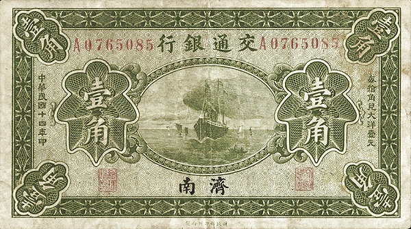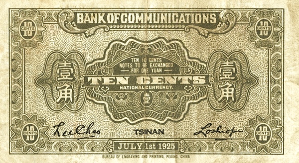 10 CENTS / 10 CENTS / BANK OF COMMUNICATIONS / TEN 10 CENTS NOTES TO BE EXCHANGED FOR ONE YUAN / TEN CENTS NATIONAL CURRENCY / TSINAN JULY 1st 1925 / 10 CENTS / 10 CENTS