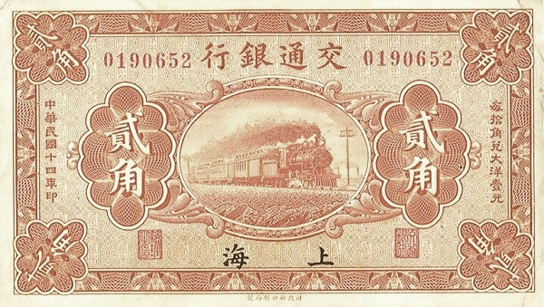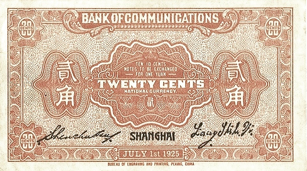 20 CENTS / 20 CENTS / BANK OF COMMUNICATIONS / TEN 10 CENTS NOTES TO BE EXCHANGED FOR ONE YUAN / TWENTY CENTS NATIONAL CURRENCY / SHANGHAI JULY 1st 1925 / 20 CENTS / 20 CENTS