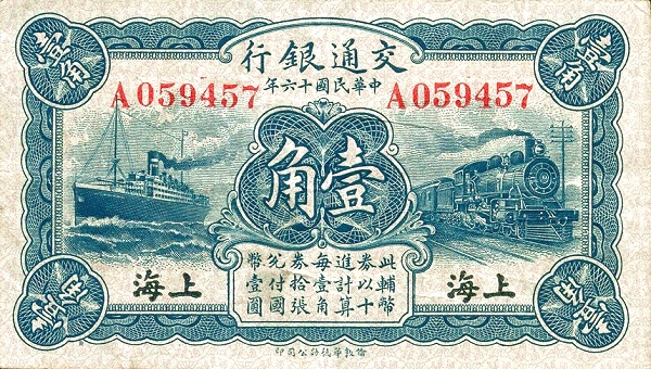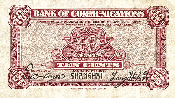 10 CENTS / 10 CENTS / BANK OF COMMUNICATIONS / PROMISES TO PAY THE BEARER ON DEMAND IN ITS OFFICE HERE ONE YUAN, NATIONAL CURRENCY, IN EXCHANGE FOR TEN SUBSIDIARY COIN NOTES OF TEN CENTS / 10 CENTS TEN CENTS / JANUARY 1st 1927 / SHANGHAI / 10 CENTS / 10 CENTS