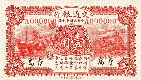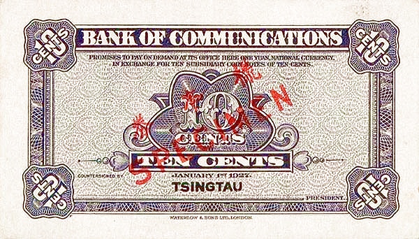 10 CENTS / 10 CENTS / BANK OF COMMUNICATIONS / PROMISES TO PAY THE BEARER ON DEMAND IN ITS OFFICE HERE ONE YUAN, NATIONAL CURRENCY, IN EXCHANGE FOR TEN SUBSIDIARY COIN NOTES OF TEN CENTS / 10 CENTS TEN CENTS / JANUARY 1st 1927 / TSINGTAU / 10 CENTS / 10 CENTS