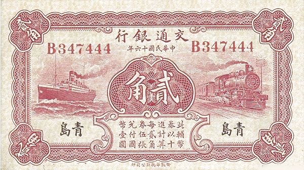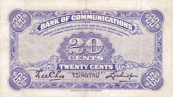 20 CENTS / 20 CENTS / BANK OF COMMUNICATIONS / PROMISES TO PAY THE BEARER ON DEMAND IN ITS OFFICE HERE ONE YUAN, NATIONAL CURRENCY, IN EXCHANGE FOR FIVE SUBSIDIARY COIN NOTES OF TWENTY CENTS / 20 CENTS TWENTY CENTS / JANUARY 1st 1927 / TSINGTAU / 20 CENTS / 20 CENTS