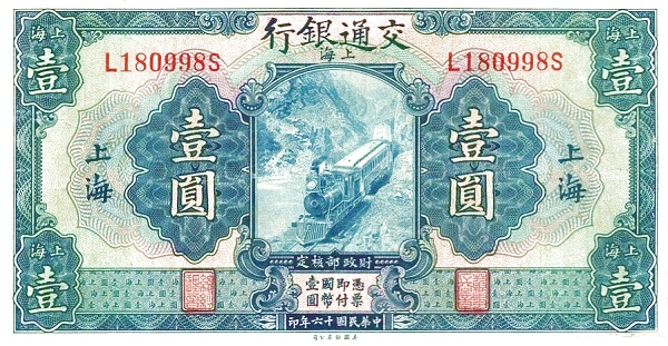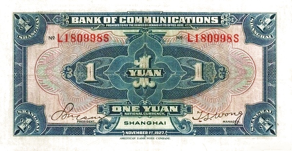 1 YUAN SHANGHAI / 1 YUAN SHANGHAI / BANK OF COMMUNICATIONS / PROMISES TO PAY THE BEARER ON DEMAND IN ITS OFFICE HERE / 1 YUAN / 1 / ONE YUAN NATIONAL CURRENCY / SHANGHAI NOVEMBER 1st 1927 / 1 YUAN SHANGHAI / 1 YUAN SHANGHAI