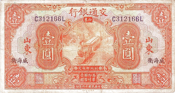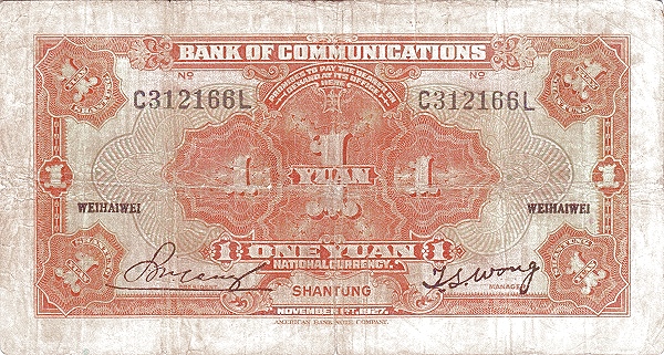1 YUAN SHANTUNG / 1 YUAN SHANTUNG / BANK OF COMMUNICATIONS / PROMISES TO PAY THE BEARER ON DEMAND IN ITS OFFICE HERE / 1 / 1 YUAN / 1 / ONE YUAN NATIONAL CURRENCY / SHANTUNG NOVEMBER 1st 1927 / 1 YUAN SHANTUNG / 1 YUAN SHANTUNG