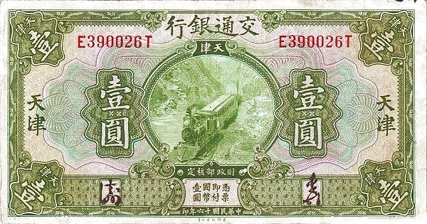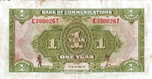 1 YUAN TIENTSIN / 1 YUAN TIENTSIN / BANK OF COMMUNICATIONS / PROMISES TO PAY THE BEARER ON DEMAND IN ITS OFFICE HERE / 1 / 1 YUAN / 1 / ONE YUAN NATIONAL CURRENCY / TIENTSIN NOVEMBER 1st 1927 / 1 YUAN TIENTSIN / 1 YUAN TIENTSIN