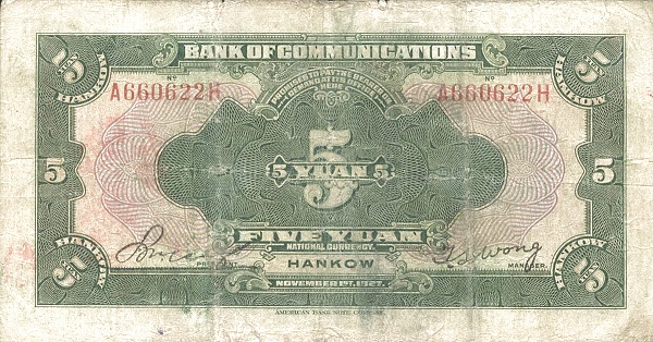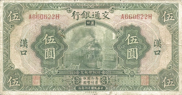 5 YUAN HANKOW / 5 YUAN HANKOW / BANK OF COMMUNICATIONS / PROMISES TO PAY THE BEARER ON DEMAND IN ITS OFFICE HERE / 5 / 5 YUAN / 5 / FIVE YUAN NATIONAL CURRENCY / HANKOW NOVEMBER 1st 1927 / 5 YUAN HANKOW / 5 YUAN HANKOW