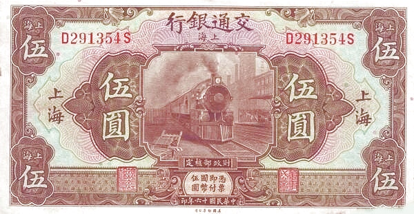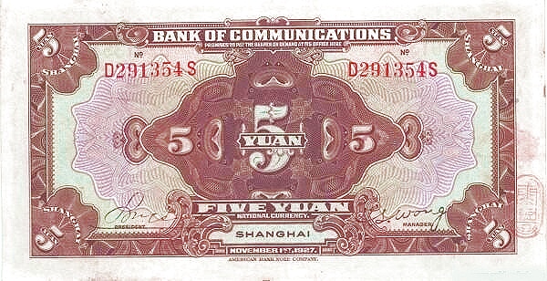 5 YUAN SHANGHAI / 5 YUAN SHANGHAI / BANK OF COMMUNICATIONS / PROMISES TO PAY THE BEARER ON DEMAND IN ITS OFFICE HERE / 5 / 5 YUAN / 5 / FIVE YUAN NATIONAL CURRENCY / SHANGHAI NOVEMBER 1st 1927 / 5 YUAN SHANGHAI / 5 YUAN SHANGHAI