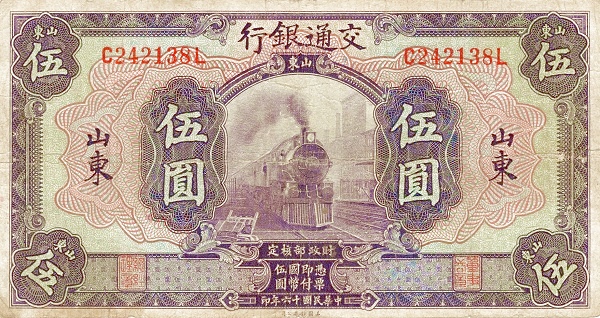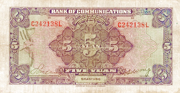 5 YUAN SHANTUNG / 5 YUAN SHANTUNG / BANK OF COMMUNICATIONS / PROMISES TO PAY THE BEARER ON DEMAND IN ITS OFFICE HERE / 5 / 5 YUAN / 5 / FIVE YUAN NATIONAL CURRENCY / SHANTUNG NOVEMBER 1st 1927 / 5 YUAN SHANTUNG / 5 YUAN SHANTUNG