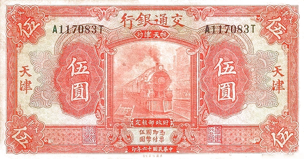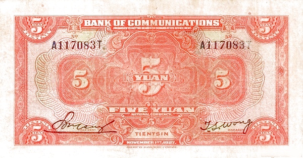 5 YUAN TIENTSIN / 5 YUAN TIENTSIN / BANK OF COMMUNICATIONS / PROMISES TO PAY THE BEARER ON DEMAND IN ITS OFFICE HERE / 5 / 5 YUAN / 5 / FIVE YUAN NATIONAL CURRENCY / TIENTSIN NOVEMBER 1st 1927 / 5 YUAN TIENTSIN / 5 YUAN TIENTSIN