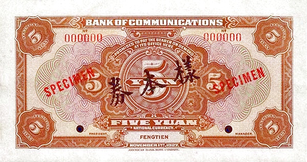 5 YUAN FENGTIEN / 5 YUAN FENGTIEN / BANK OF COMMUNICATIONS / PROMISES TO PAY THE BEARER ON DEMAND IN ITS OFFICE HERE / 5 / 5 YUAN / 5 / FIVE YUAN NATIONAL CURRENCY / FENGTIEN NOVEMBER 1st 1927 / 5 YUAN FENGTIEN / 5 YUAN FENGTIEN