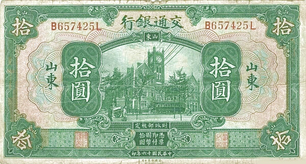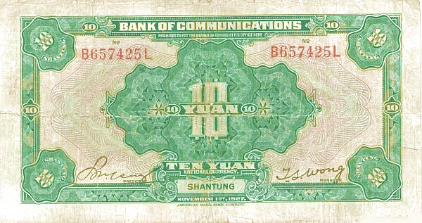 10 YUAN SHANTUNG / 10 YUAN SHANTUNG / BANK OF COMMUNICATIONS / PROMISES TO PAY THE BEARER ON DEMAND IN ITS OFFICE HERE / 10 / 10 YUAN / 10 / TEN YUAN NATIONAL CURRENCY / SHANTUNG NOVEMBER 1st 1927 / 10 YUAN SHANTUNG / 10 YUAN SHANTUNG