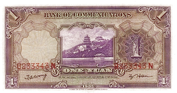 1 / 1 / BANK OF COMMUNICATIONS / 1 / ONE YUAN OF THE NATIONAL CURRENCY OF THE REPUBLIC OF CHINA / 1935 / 1 / 1
