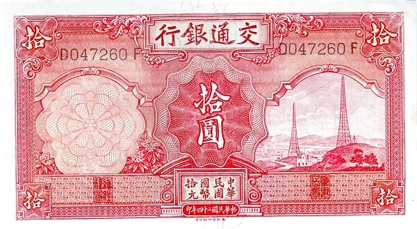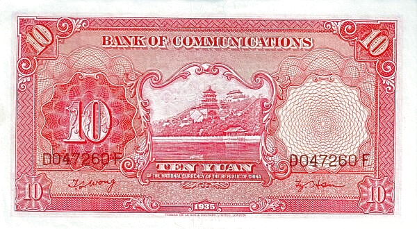 10 / 10 / BANK OF COMMUNICATIONS / 10 / TEN YUAN OF THE NATIONAL CURRENCY OF THE REPUBLIC OF CHINA / 1935 / 10 / 10