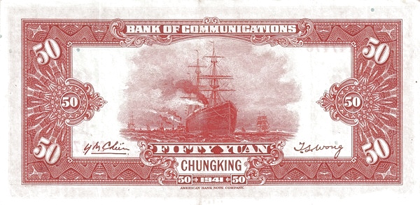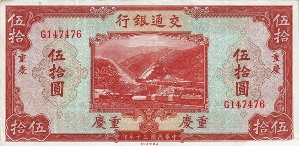 50 / 50 / BANK OF COMMUNICATIONS / 50 / FIFTY YUAN / 50 / CHUNGKING / 1941 / 50 / 50