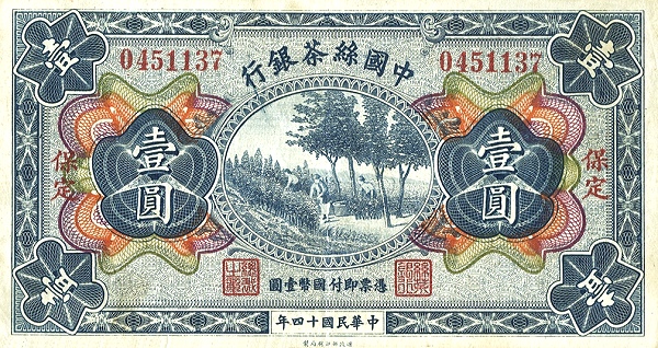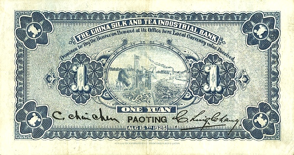 1 / 1 / THE CHINA SILK AND TEA INDUSTRIAL BANK / PROMISES TO PAY THE BEARER ON DEMAND AT ITS OFFICE LOCAL CURRENCY VALUE RECIEVED / 1 ONE YUAN 1 / PAOTING / AUG 15th 1925 / 1 / 1