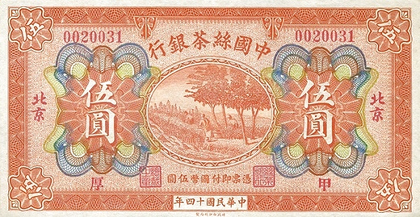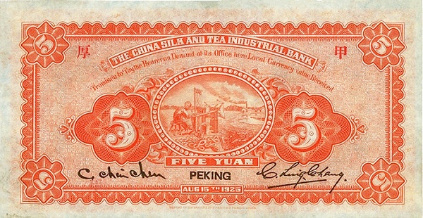 5 / 5 / THE CHINA SILK AND TEA INDUSTRIAL BANK / PROMISES TO PAY THE BEARER ON DEMAND AT ITS OFFICE LOCAL CURRENCY VALUE RECIEVED / 5 FIVE YUAN 5 / PEKING / AUG 15th 1925 / 5 / 5
