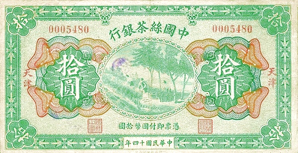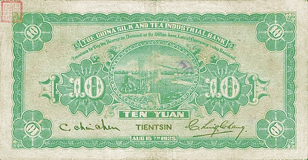10 / 10 / THE CHINA SILK AND TEA INDUSTRIAL BANK / PROMISES TO PAY THE BEARER ON DEMAND AT ITS OFFICE LOCAL CURRENCY VALUE RECIEVED / 10 TEN YUAN 10 / TIENTSIN / AUG 15th 1925 / 10 / 10