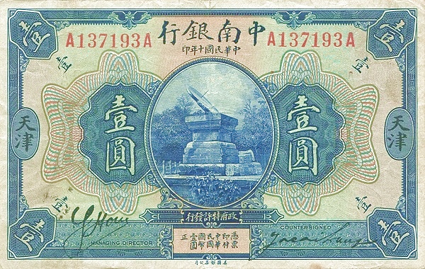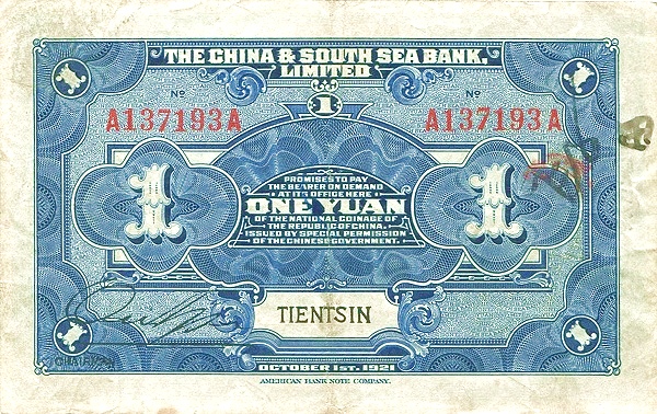 1 / 1 / THE CHINA & SOUTH SEA BANK LIMITED / PROMISES TO PAY THE BEARER ON DEMAND AT ITS OFFICE ONE YUAN OF THE NATIONAL COINAGE OF THE REPUBLIC OF CHINA. ISSUED BY SPECIAL PERMISSION OF THE CHINESE GOVERNMENT / 1 / TIENTSIN / OCTOBER 1st 1921 / 1 / 1