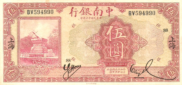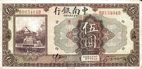 5 / 5 / THE CHINA & SOUTH SEA BANK LIMITED / PROMISES TO PAY THE BEARER ON DEMAND AT ITS OFFICE FIVE YUAN OF THE NATIONAL COINAGE OF THE REPUBLIC OF CHINA. ISSUED BY SPECIAL PERMISSION OF THE CHINESE GOVERNMENT / SHANGHAI / 1927 / 5 / 5