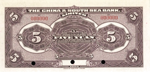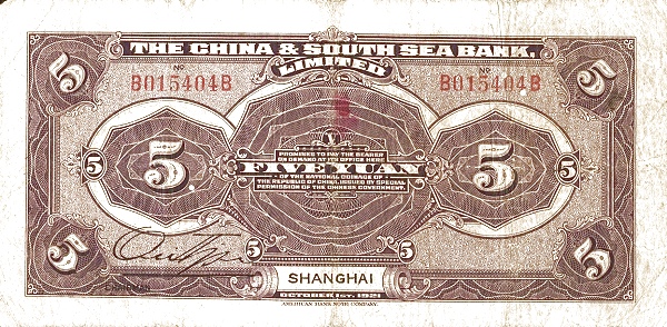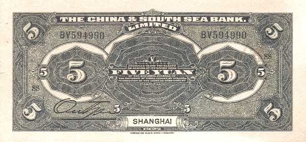 5 / 5 / THE CHINA & SOUTH SEA BANK LIMITED / PROMISES TO PAY THE BEARER ON DEMAND AT ITS OFFICE FIVE YUAN OF THE NATIONAL COINAGE OF THE REPUBLIC OF CHINA. ISSUED BY SPECIAL PERMISSION OF THE CHINESE GOVERNMENT / 5 / SHANGHAI / OCTOBER 1st 1921 / 5 / 5