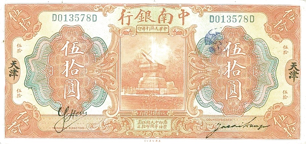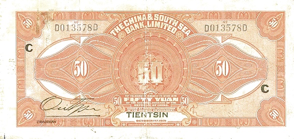 50 / 50 / THE CHINA & SOUTH SEA BANK LIMITED / PROMISES TO PAY THE BEARER ON DEMAND AT ITS OFFICE FIFTY YUAN OF THE NATIONAL COINAGE OF THE REPUBLIC OF CHINA. ISSUED BY SPECIAL PERMISSION OF THE CHINESE GOVERNMENT / 50 / TIENTSIN / OCTOBER 1st 1921 / 50 / 50