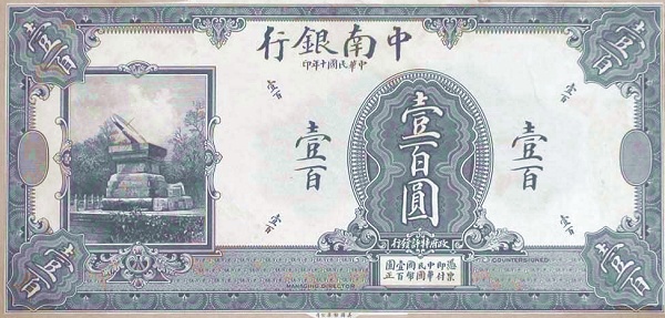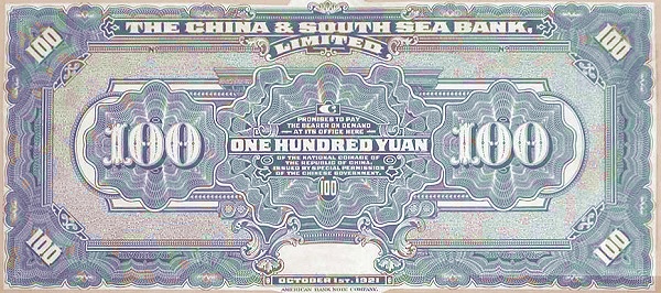 100 / 100 / THE CHINA & SOUTH SEA BANK LIMITED / PROMISES TO PAY THE BEARER ON DEMAND AT ITS OFFICE ONE HUNDRID YUAN OF THE NATIONAL COINAGE OF THE REPUBLIC OF CHINA. ISSUED BY SPECIAL PERMISSION OF THE CHINESE GOVERNMENT / 100 / OCTOBER 1st 1921 / 100 / 100