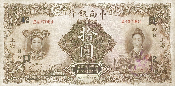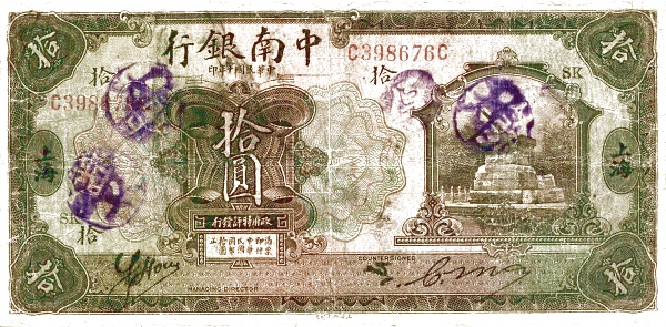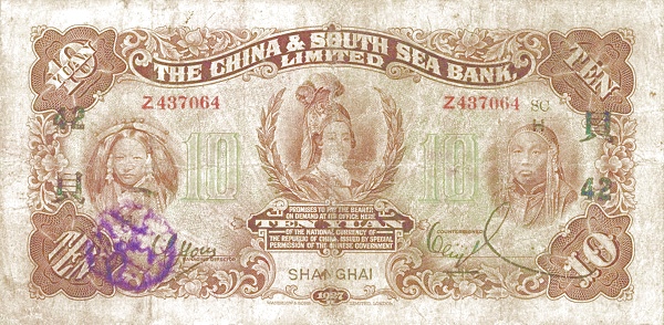 10 / TEN / THE CHINA & SOUTH SEA BANK LIMITED / PROMISES TO PAY THE BEARER ON DEMAND AT ITS OFFICE TEN YUAN OF THE NATIONAL COINAGE OF THE REPUBLIC OF CHINA. ISSUED BY SPECIAL PERMISSION OF THE CHINESE GOVERNMENT / SHANGHAI / 1927 / TEN / 10