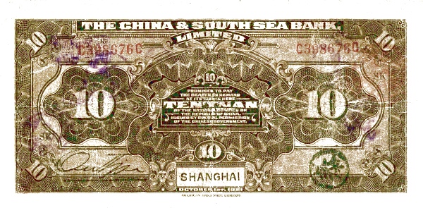 10 / 10 / THE CHINA & SOUTH SEA BANK LIMITED / PROMISES TO PAY THE BEARER ON DEMAND AT ITS OFFICE TEN YUAN OF THE NATIONAL COINAGE OF THE REPUBLIC OF CHINA. ISSUED BY SPECIAL PERMISSION OF THE CHINESE GOVERNMENT / 10 / SHANGHAI / OCTOBER 1st 1921 / 10 / 10