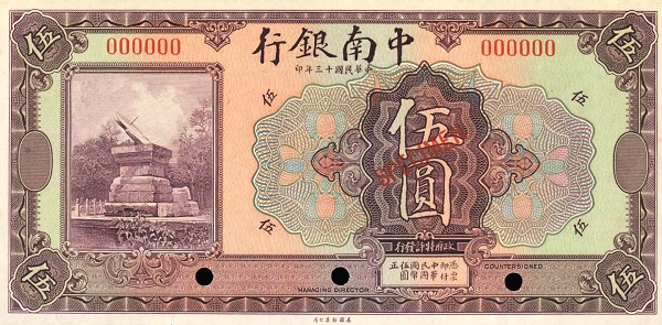 5 / 5 / THE CHINA & SOUTH SEA BANK LIMITED / PROMISES TO PAY THE BEARER ON DEMAND AT ITS OFFICE FIVE YUAN OF THE NATIONAL COINAGE OF THE REPUBLIC OF CHINA. ISSUED BY SPECIAL PERMISSION OF THE CHINESE GOVERNMENT / 5 / 1924 / 5 / 5