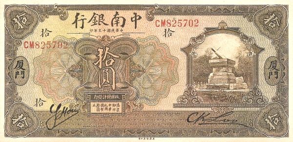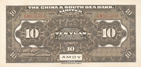 10 / 10 / THE CHINA & SOUTH SEA BANK LIMITED / PROMISES TO PAY THE BEARER ON DEMAND AT ITS OFFICE TEN YUAN OF THE NATIONAL COINAGE OF THE REPUBLIC OF CHINA. ISSUED BY SPECIAL PERMISSION OF THE CHINESE GOVERNMENT / 10 / AMOY / 1924 / 10 / 10
