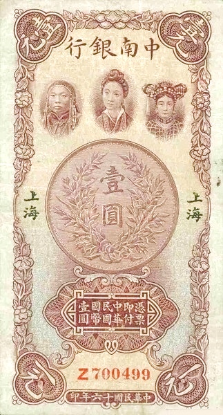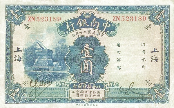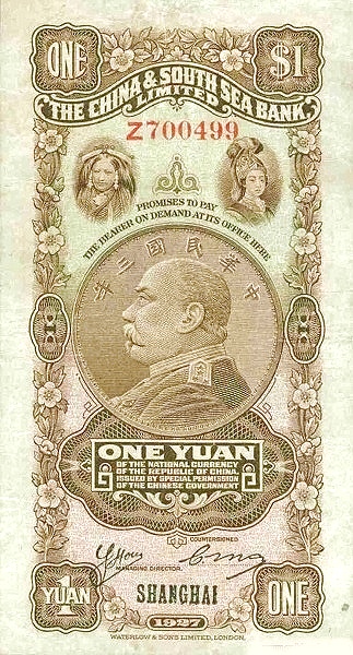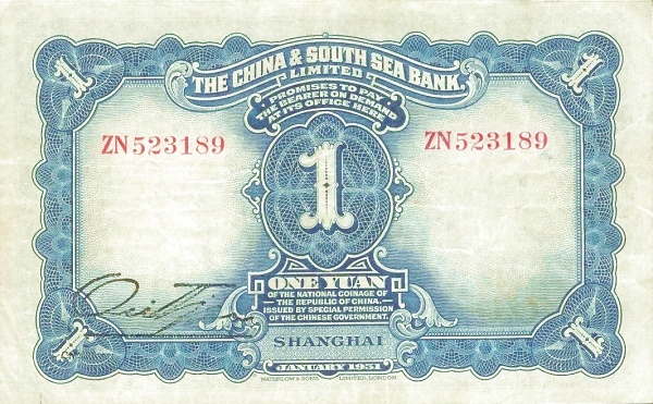1 / 1 / THE CHINA & SOUTH SEA BANK LIMITED / PROMISES TO PAY THE BEARER ON DEMAND AT ITS OFFICE 1 ONE YUAN OF THE NATIONAL COINAGE OF THE REPUBLIC OF CHINA. ISSUED BY SPECIAL PERMISSION OF THE CHINESE GOVERNMENT / SHANGHAI / JANUARY 1931 / 1 / 1