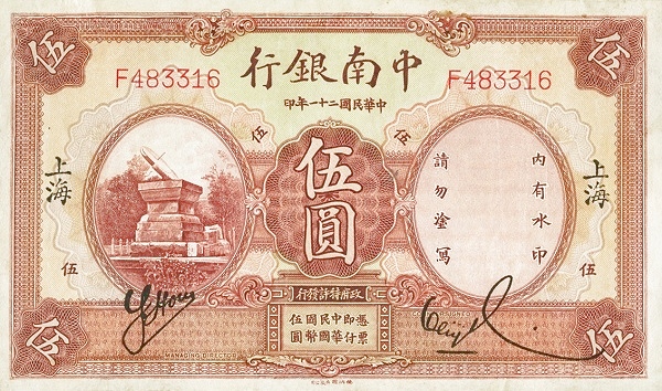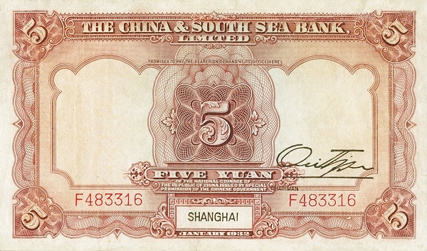 5 / 5 / THE CHINA & SOUTH SEA BANK LIMITED / PROMISES TO PAY THE BEARER ON DEMAND AT ITS OFFICE 5 FIVE YUAN OF THE NATIONAL COINAGE OF THE REPUBLIC OF CHINA. ISSUED BY SPECIAL PERMISSION OF THE CHINESE GOVERNMENT / SHANGHAI / JANUARY 1932 / 5 / 5