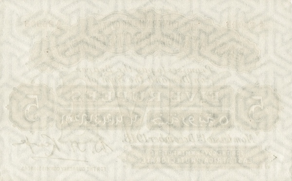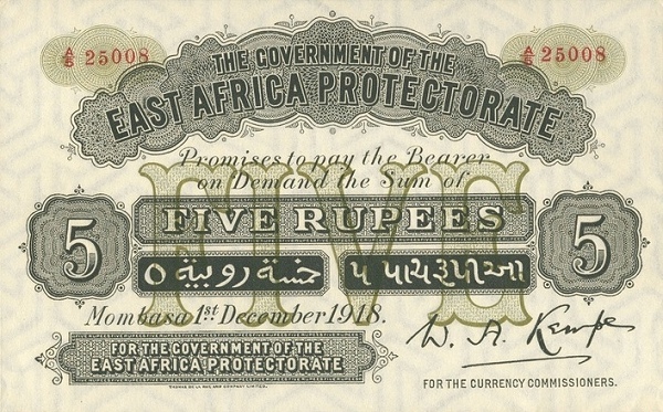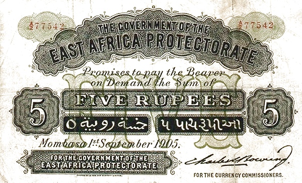 BEARER ON DEMAND THE SUM OF / 5 FIVE RUPEES 5 / MOMBASA (date) /
