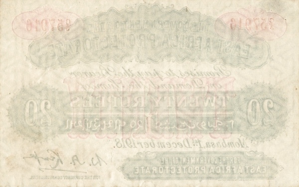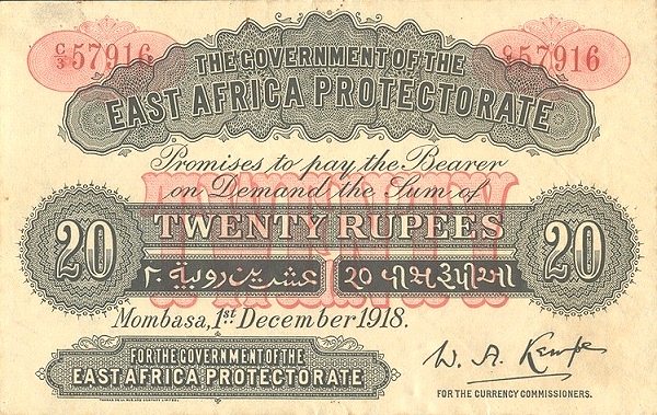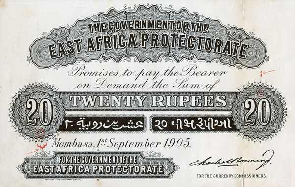 BEARER ON DEMAND THE SUM OF / 20 TWENTY RUPEES 20 / MOMBASA (date) / FOR THE GOVERNMENT OF THE EAST AFRICA PROTECTORATE